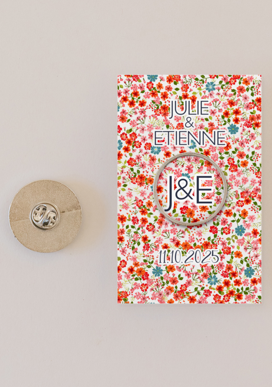 - Offrez à vos invités un pin’s personnalisé de mariage qui fera toute la différence : un petit accessoire tendance, élégant et totalement à votre image. Personnalisable avec vos prénoms, votre date et un visuel unique, ce pin’s devient un souvenir mémorable que chacun pourra conserver et porter. Un cadeau original, durable et irrésistible pour célébrer votre plus beau jour.