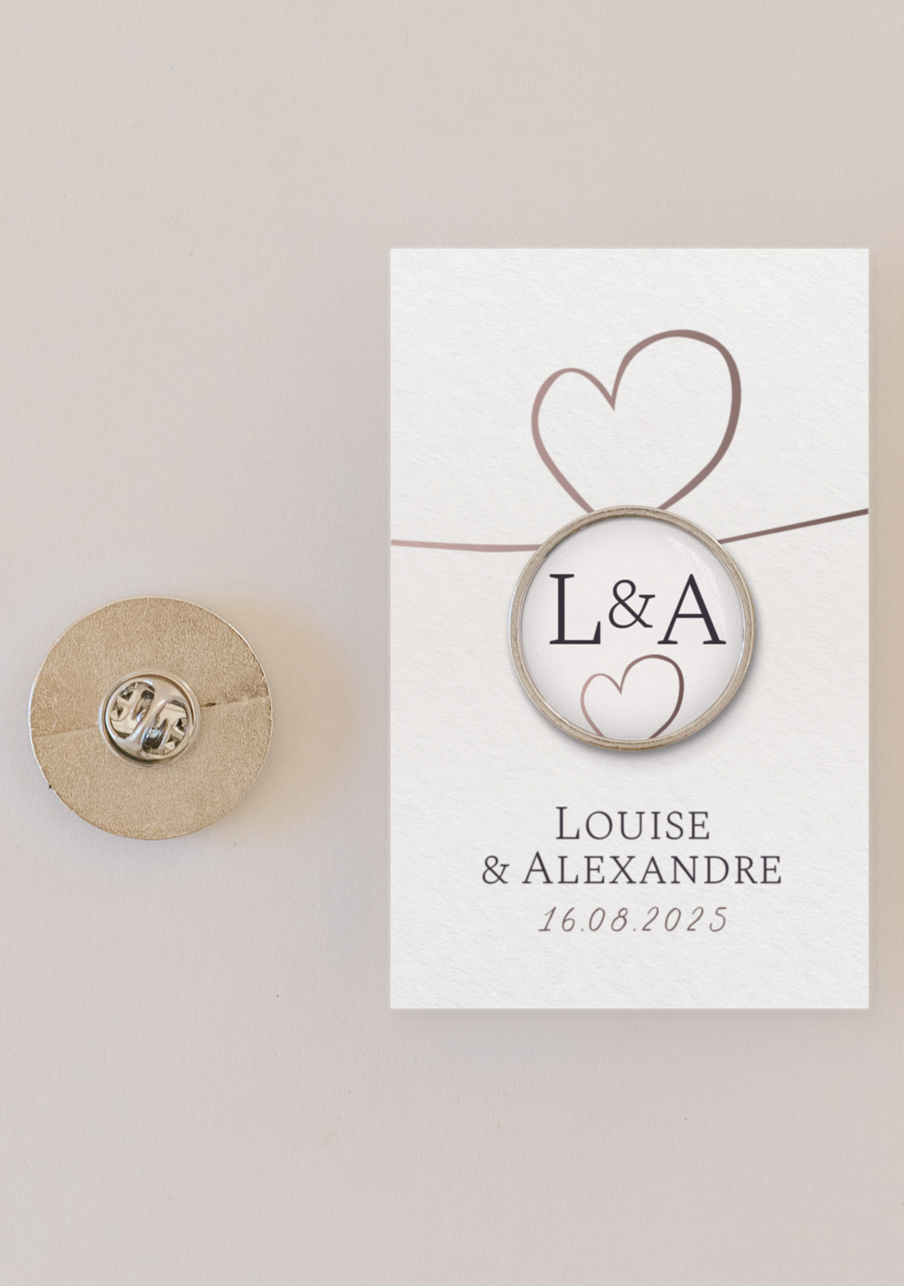 - Offrez à vos invités un pin’s personnalisé de mariage qui fera toute la différence : un petit accessoire tendance, élégant et totalement à votre image. Personnalisable avec vos prénoms, votre date et un visuel unique, ce pin’s devient un souvenir mémorable que chacun pourra conserver et porter. Un cadeau original, durable et irrésistible pour célébrer votre plus beau jour.