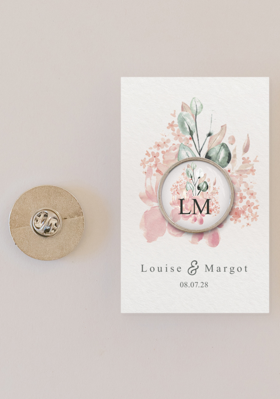 - Offrez à vos invités un pin’s personnalisé de mariage qui fera toute la différence : un petit accessoire tendance, élégant et totalement à votre image. Personnalisable avec vos prénoms, votre date et un visuel unique, ce pin’s devient un souvenir mémorable que chacun pourra conserver et porter. Un cadeau original, durable et irrésistible pour célébrer votre plus beau jour.