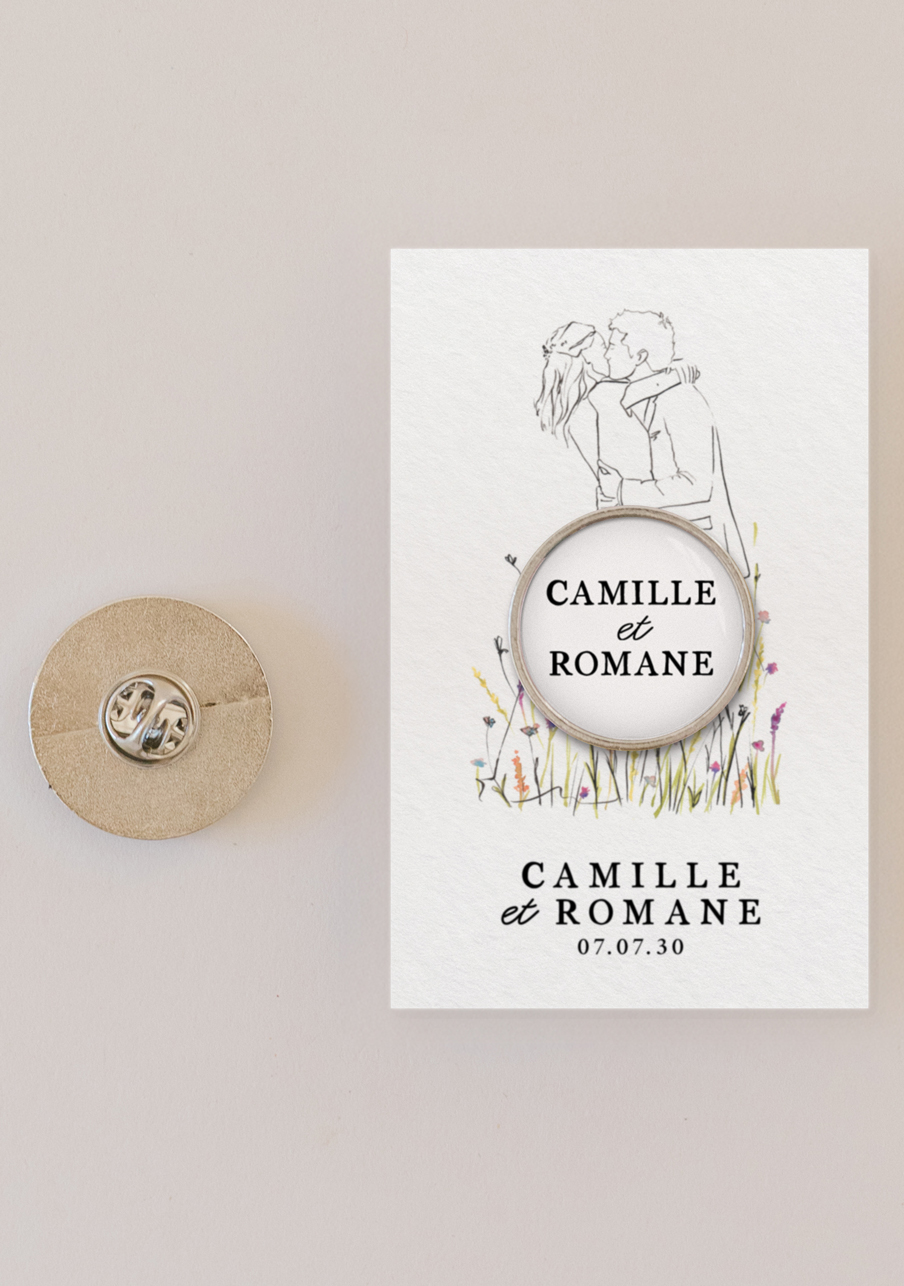 - Offrez à vos invités un pin’s personnalisé de mariage qui fera toute la différence : un petit accessoire tendance, élégant et totalement à votre image. Personnalisable avec vos prénoms, votre date et un visuel unique, ce pin’s devient un souvenir mémorable que chacun pourra conserver et porter. Un cadeau original, durable et irrésistible pour célébrer votre plus beau jour.