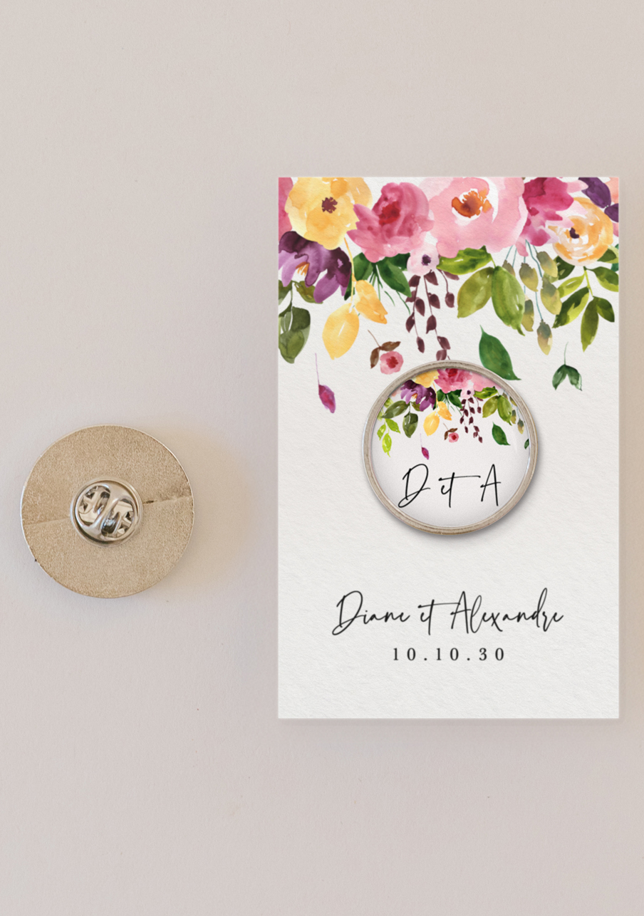 - Offrez à vos invités un pin’s personnalisé de mariage qui fera toute la différence : un petit accessoire tendance, élégant et totalement à votre image. Personnalisable avec vos prénoms, votre date et un visuel unique, ce pin’s devient un souvenir mémorable que chacun pourra conserver et porter. Un cadeau original, durable et irrésistible pour célébrer votre plus beau jour.