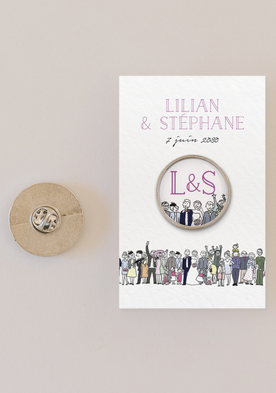 - Offrez à vos invités un pin’s personnalisé de mariage qui fera toute la différence : un petit accessoire tendance, élégant et totalement à votre image. Personnalisable avec vos prénoms, votre date et un visuel unique, ce pin’s devient un souvenir mémorable que chacun pourra conserver et porter. Un cadeau original, durable et irrésistible pour célébrer votre plus beau jour.