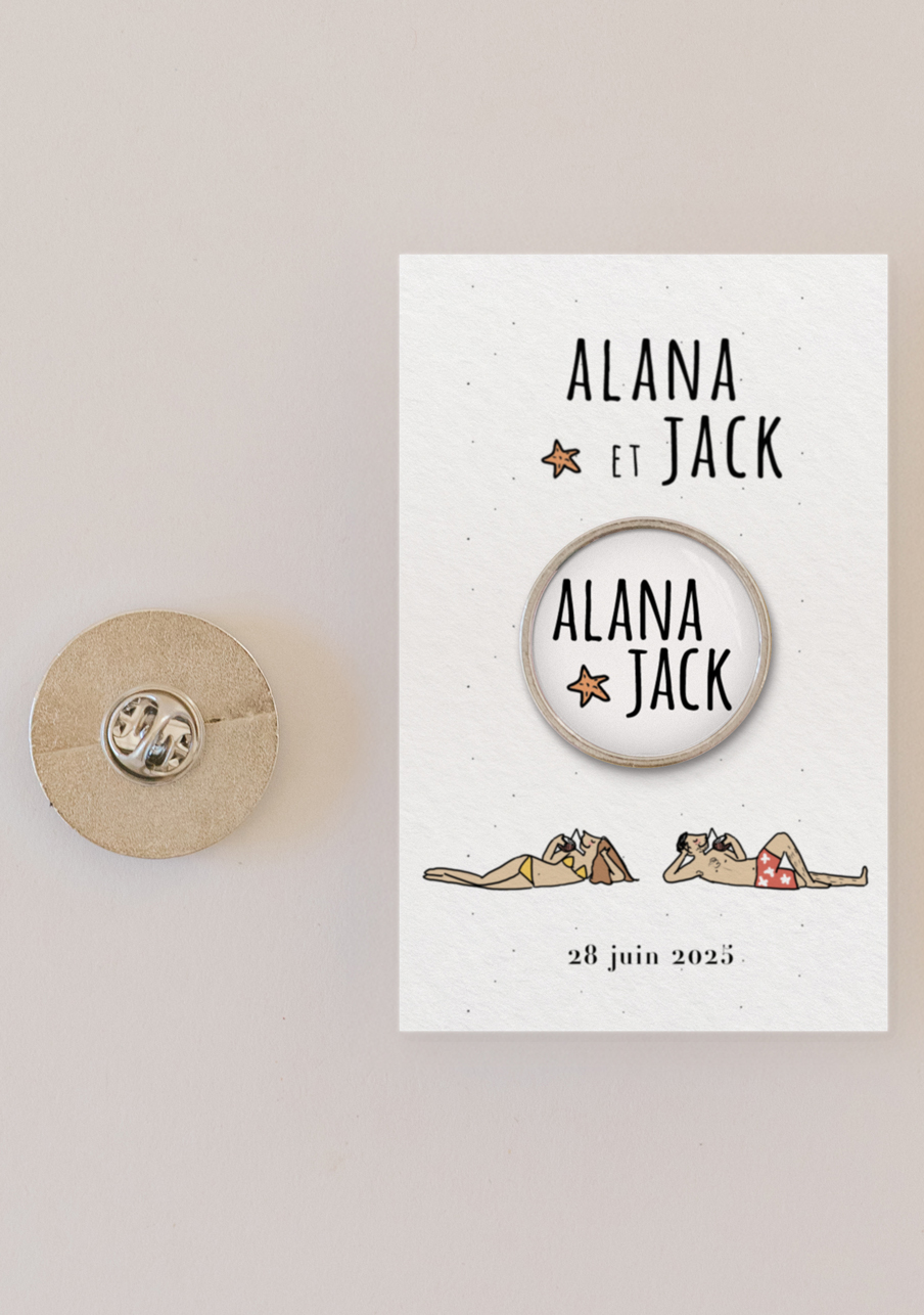 - Offrez à vos invités un pin’s personnalisé de mariage qui fera toute la différence : un petit accessoire tendance, élégant et totalement à votre image. Personnalisable avec vos prénoms, votre date et un visuel unique, ce pin’s devient un souvenir mémorable que chacun pourra conserver et porter. Un cadeau original, durable et irrésistible pour célébrer votre plus beau jour.