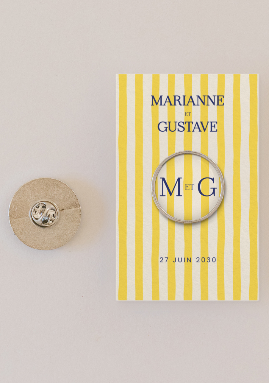 - Offrez à vos invités un pin’s personnalisé de mariage qui fera toute la différence : un petit accessoire tendance, élégant et totalement à votre image. Personnalisable avec vos prénoms, votre date et un visuel unique, ce pin’s devient un souvenir mémorable que chacun pourra conserver et porter. Un cadeau original, durable et irrésistible pour célébrer votre plus beau jour.