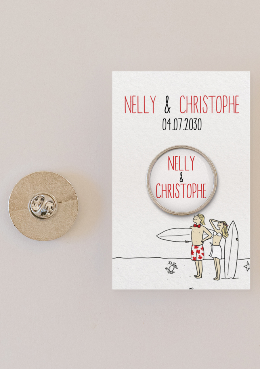 - Offrez à vos invités un pin’s personnalisé de mariage qui fera toute la différence : un petit accessoire tendance, élégant et totalement à votre image. Personnalisable avec vos prénoms, votre date et un visuel unique, ce pin’s devient un souvenir mémorable que chacun pourra conserver et porter. Un cadeau original, durable et irrésistible pour célébrer votre plus beau jour.