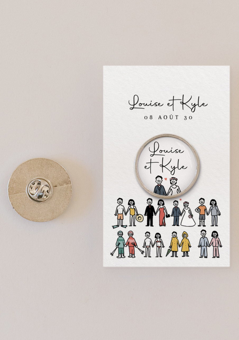 - Offrez à vos invités un pin’s personnalisé de mariage qui fera toute la différence : un petit accessoire tendance, élégant et totalement à votre image. Personnalisable avec vos prénoms, votre date et un visuel unique, ce pin’s devient un souvenir mémorable que chacun pourra conserver et porter. Un cadeau original, durable et irrésistible pour célébrer votre plus beau jour.
