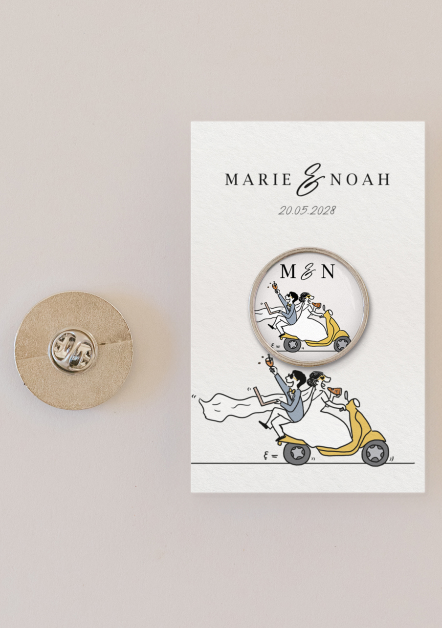 - Offrez à vos invités un pin’s personnalisé de mariage qui fera toute la différence : un petit accessoire tendance, élégant et totalement à votre image. Personnalisable avec vos prénoms, votre date et un visuel unique, ce pin’s devient un souvenir mémorable que chacun pourra conserver et porter. Un cadeau original, durable et irrésistible pour célébrer votre plus beau jour.