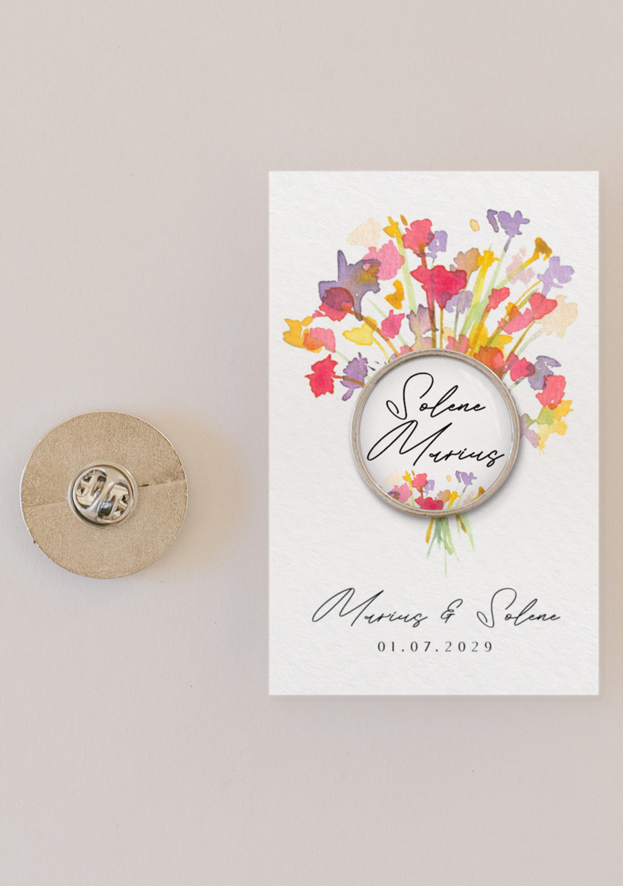 - Offrez à vos invités un pin’s personnalisé de mariage qui fera toute la différence : un petit accessoire tendance, élégant et totalement à votre image. Personnalisable avec vos prénoms, votre date et un visuel unique, ce pin’s devient un souvenir mémorable que chacun pourra conserver et porter. Un cadeau original, durable et irrésistible pour célébrer votre plus beau jour.