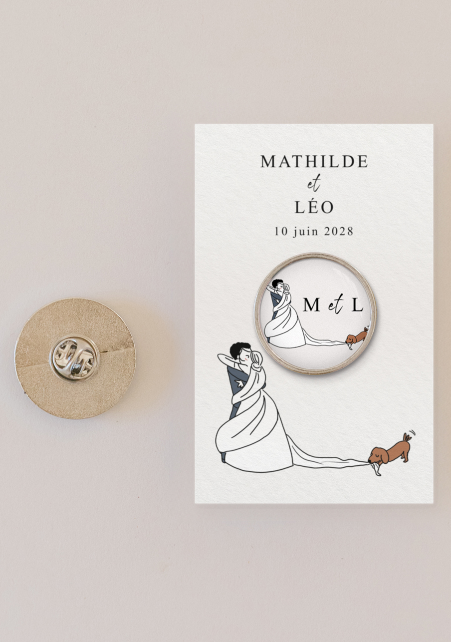 - Offrez à vos invités un pin’s personnalisé de mariage qui fera toute la différence : un petit accessoire tendance, élégant et totalement à votre image. Personnalisable avec vos prénoms, votre date et un visuel unique, ce pin’s devient un souvenir mémorable que chacun pourra conserver et porter. Un cadeau original, durable et irrésistible pour célébrer votre plus beau jour.