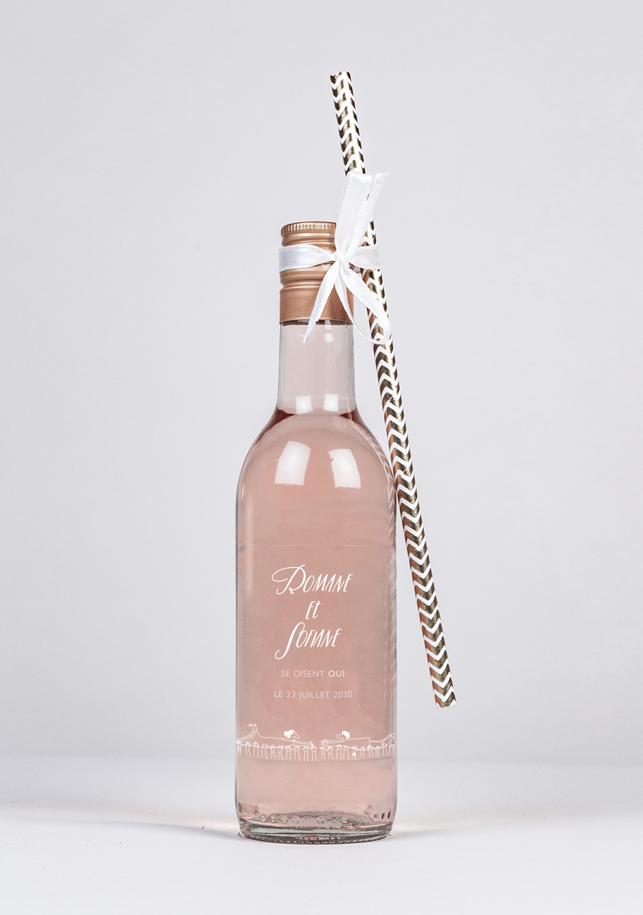 - Conditionnement : Carton contenant 24 bouteilles accompagnées de 24 pailles blanches ornées de chevrons dorés et d'un ruban effet satin de couleur crème et d'une longueur de 25 m