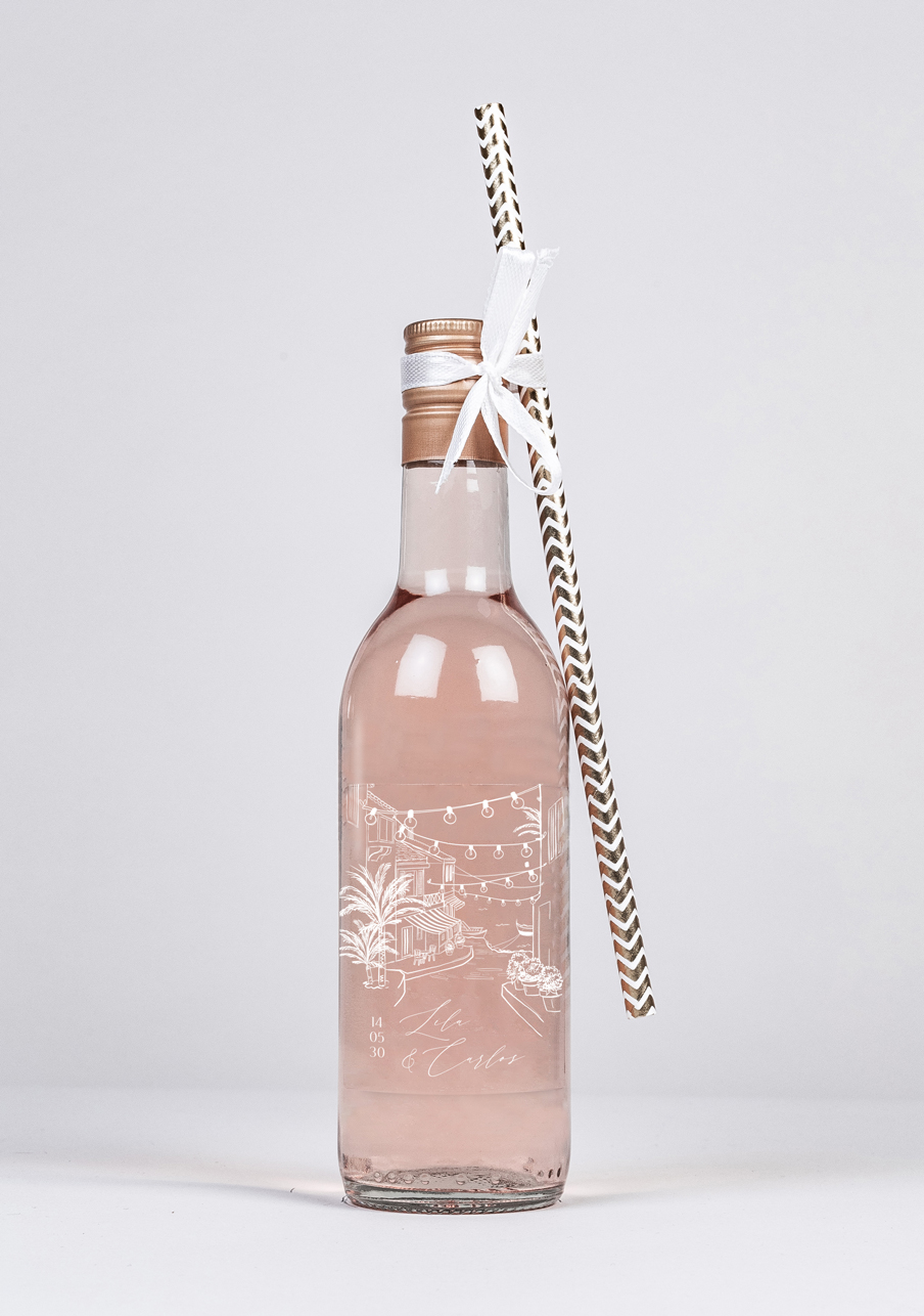 - Conditionnement : Carton contenant 24 bouteilles accompagnées de 24 pailles blanches ornées de chevrons dorés et d'un ruban effet satin de couleur crème et d'une longueur de 25 m