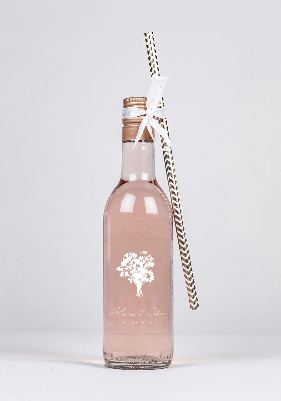 - Conditionnement : Carton contenant 24 bouteilles accompagnées de 24 pailles blanches ornées de chevrons dorés et d'un ruban effet satin de couleur crème et d'une longueur de 25 m