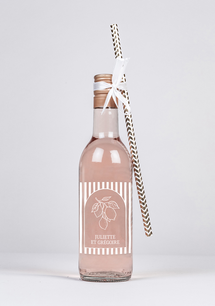 - Conditionnement : Carton contenant 24 bouteilles accompagnées de 24 pailles blanches ornées de chevrons dorés et d'un ruban effet satin de couleur crème et d'une longueur de 25 m