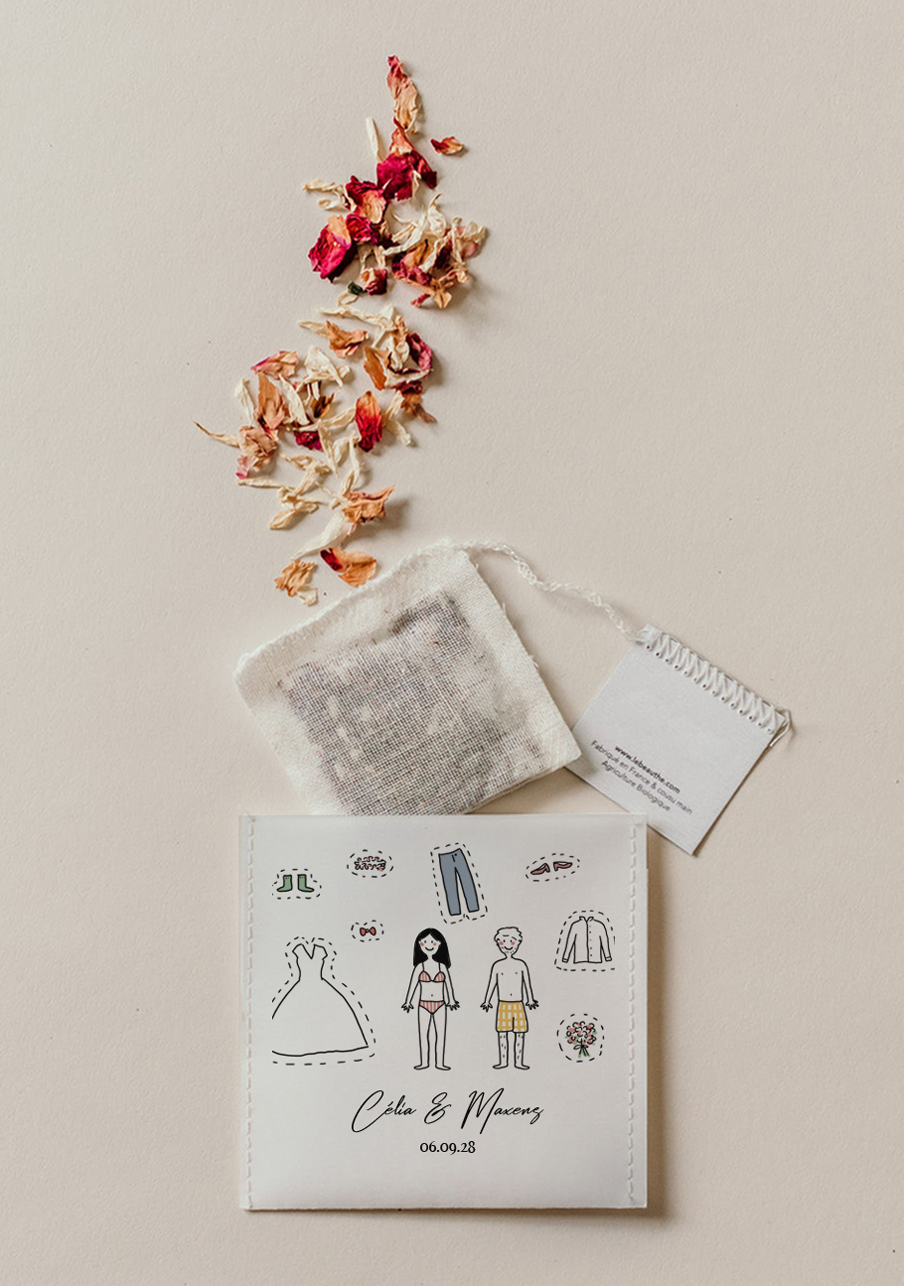 - Sachet biologiques et compostables : surenveloppe en papier texturé premium sourcé en UE et mousseline en coton biologique certifié Ecocert.