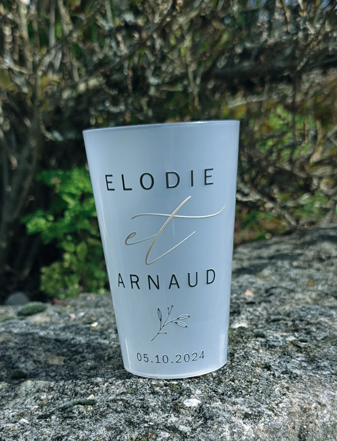 Merci pour ces jolies réalisations : un Ecocup personnalisé aux couleurs du mariage et dessin du faire-part, un beau souvenir de cette journée inoubliable et un cadeau utile et bien apprécié ! Nous en sommes ravis !